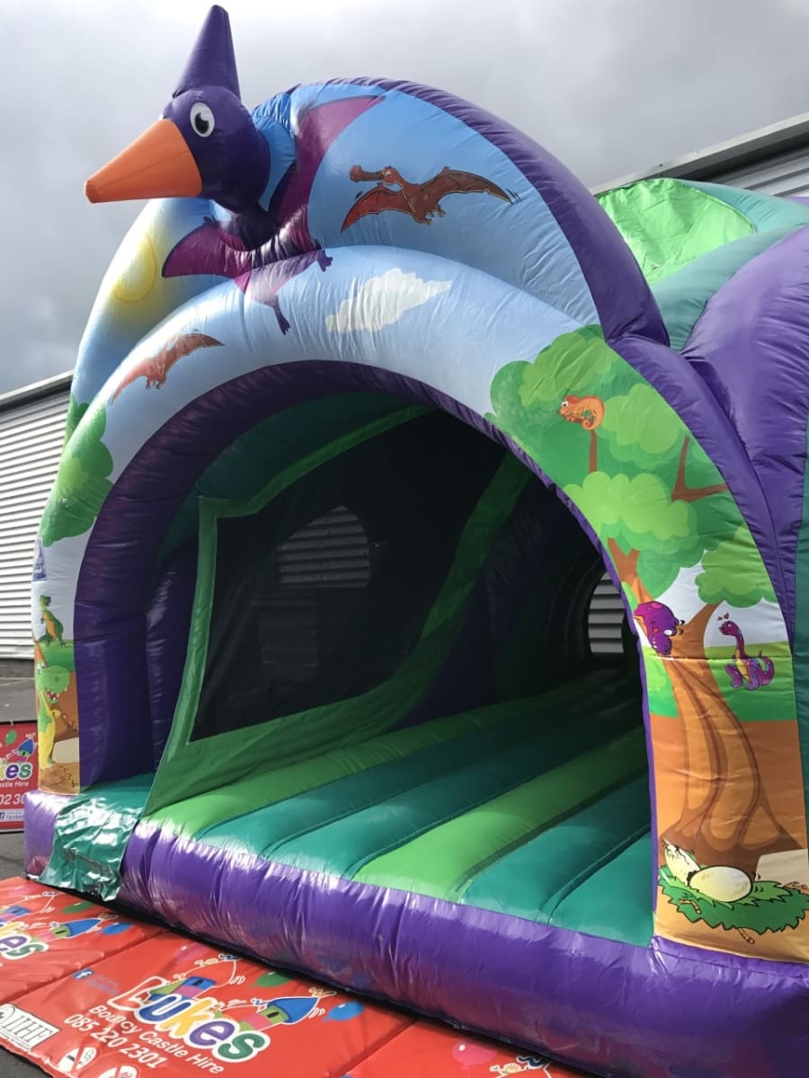 I have to admit i am amazed at the quality our supplier is producing new and trendy castles for us, this castle in particular has an 8ft platform slide inside, please have a look at the picture you will see the slide actually goes from one side of the castle to the other, 3D dinosaur theme, me personally i think the 3D addition is another reason this unit is so eye catching, standing at almost 15ft high this is a large castle with lots of room for children and the occasional adult :) our Fun Food is a nice treat to add on to also avail of our online discount