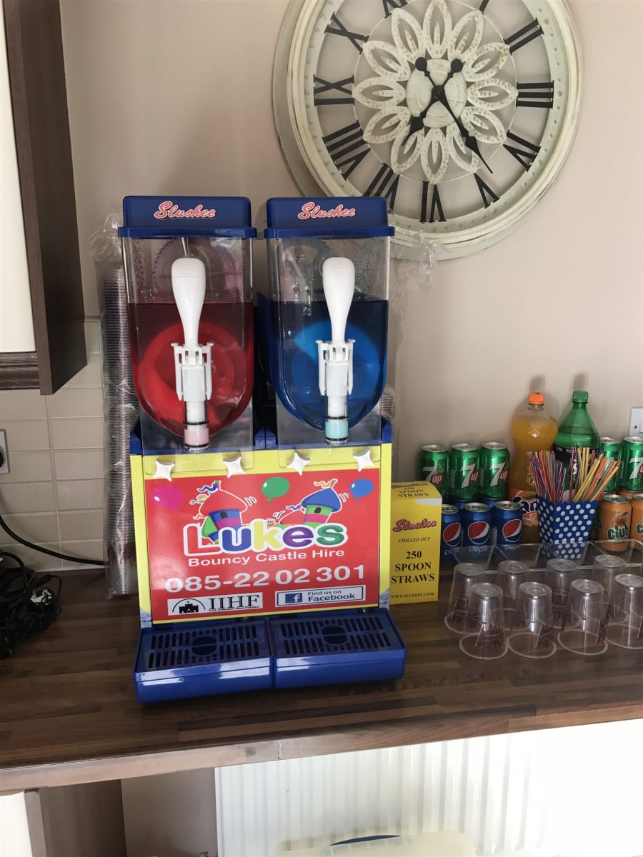Our machine comes wit: 100 servings for €130, it really is a fun and cool addition to any party, and also if you have a bouncy castle it helps to cool down the kids, coming with a red and blue mix which is mouth watering in the heat, helping to quench the thirst, you can also get some slush yards, but are an additional cost Party Extras