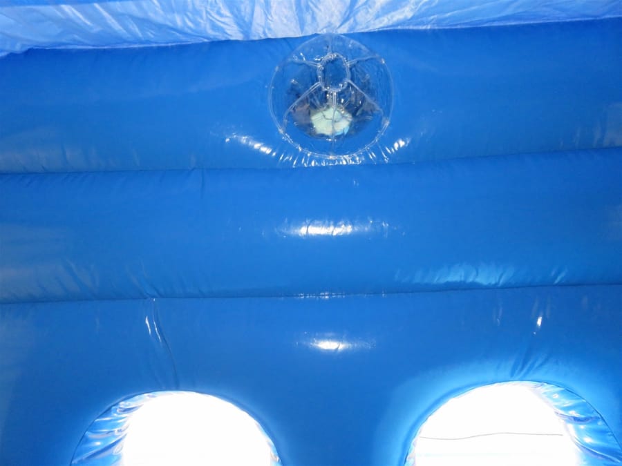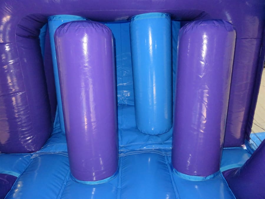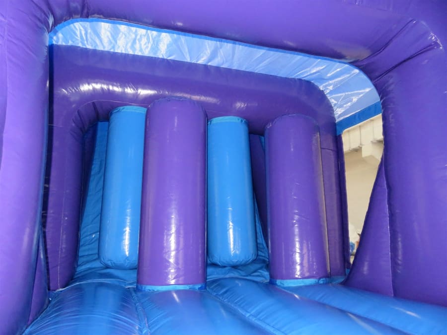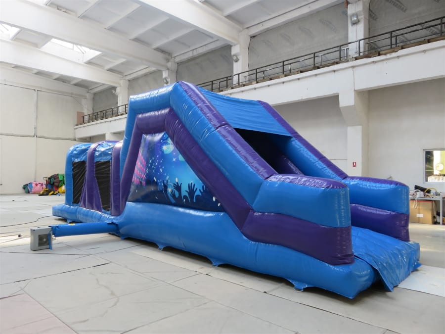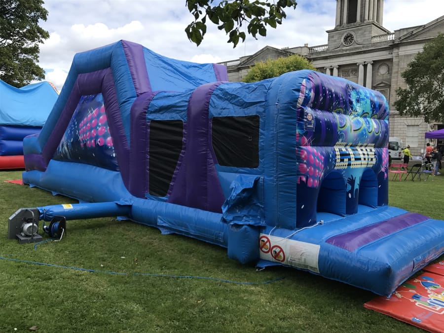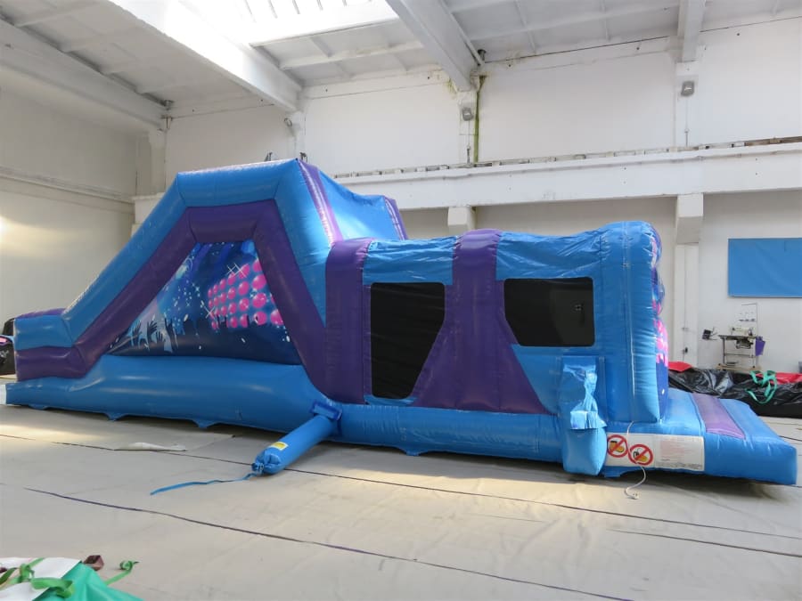 This obstacle course is 33ft long 10ft wide and has a slide at the exit at 8ft high, dashing through the tunnels at the front and the pillars on the inside to climb up the ladder and slide out the opposite end, this unit will no doubt go down as a big hit on any occasion, and just to mention again you can have music playing inside the unit, we supply the speaker and lights all you have to do is request the extra equipment and we will provide free of charge :)